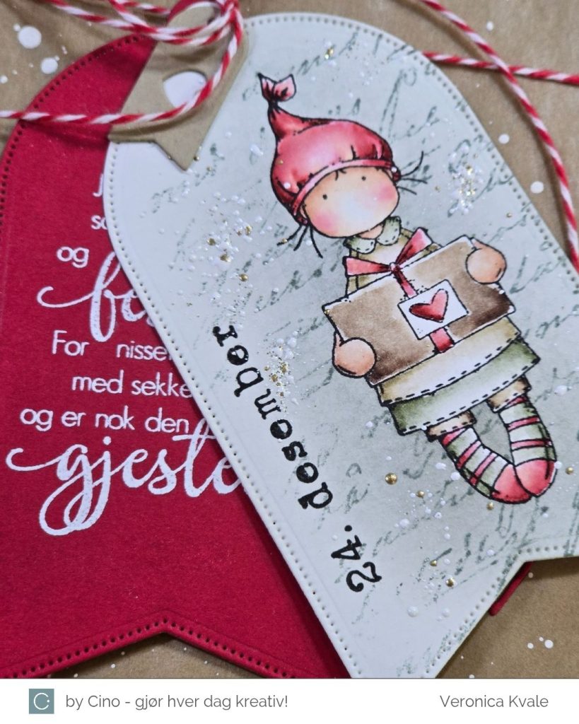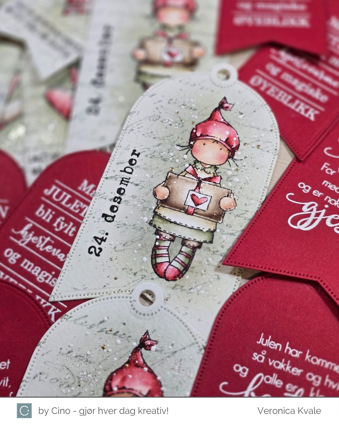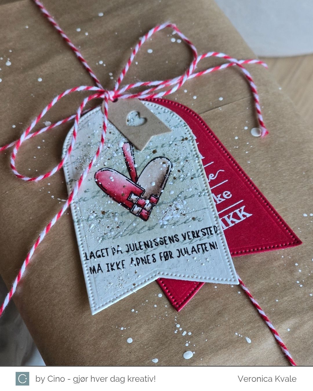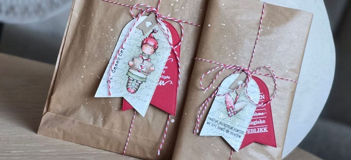 Årets julegave i nettbutikken ble utsolgt på mindre enn et halvt døgn, og det er utrolig moro at den fikk så bra respons! Siden jeg ikke klarte å skaffe påfyll av alle produktene valgte jeg å lage en liten julegave i tillegg, og denne inneholdt alle produktene unntatt ett. Som inspirasjon til bruk av innholdet har jeg laget noen kort som jeg kommer til å presentere de nærmeste dagene. I dag får dere derimot se flere bilder av de håndlagde pakkelappene.