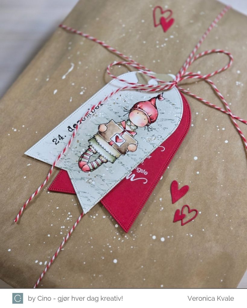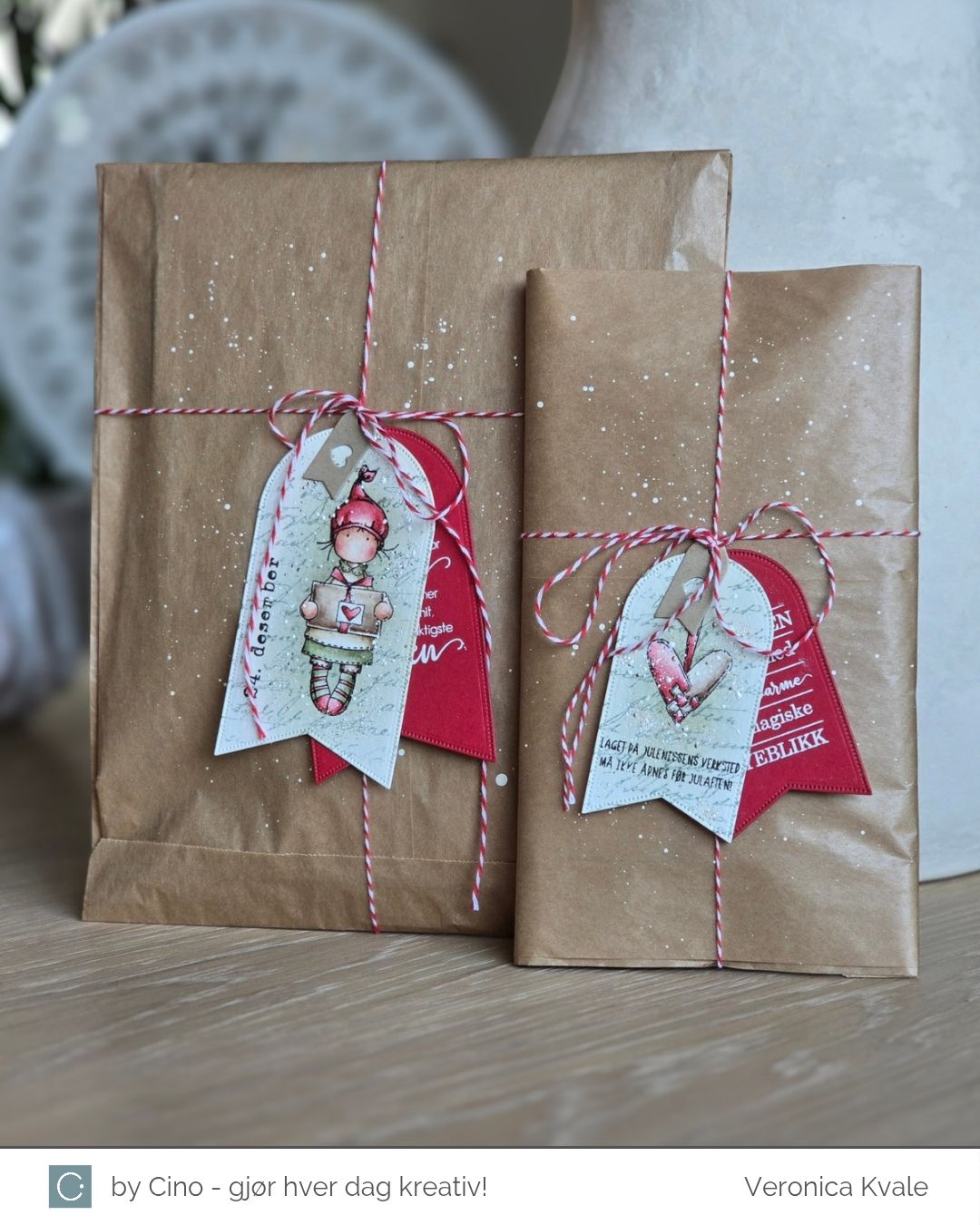 Under hjertet har jeg stemplet to små tekster fra settet ‘Frostens magi’, og teksten på den lille, røde tagen kommer også fra det samme settet. Pakkene er pakket inn i brune papirposer som jeg har sprutet litt hvit gouache over, og deretter brukt rød og hvit Bakers Twine fra Hemptique.