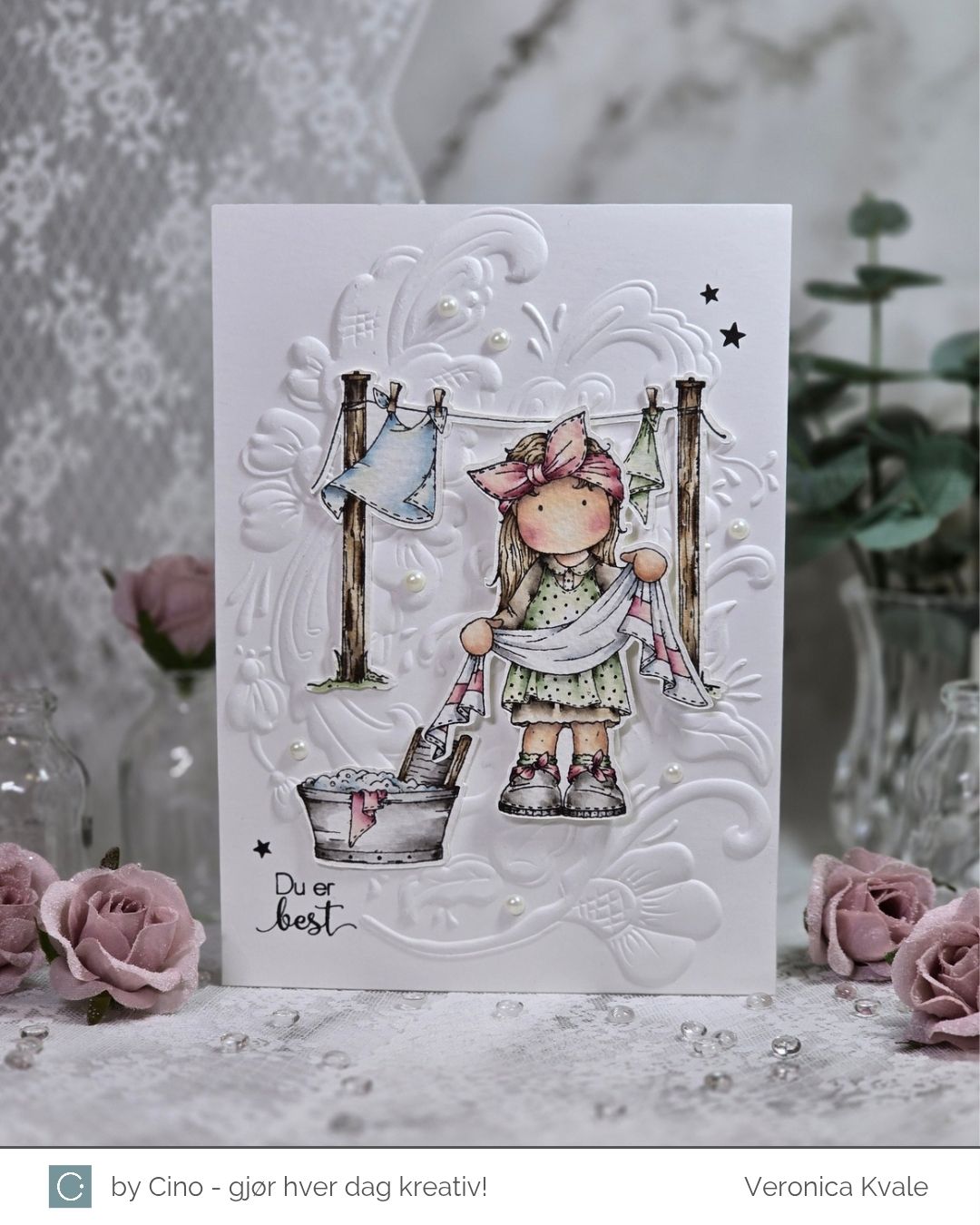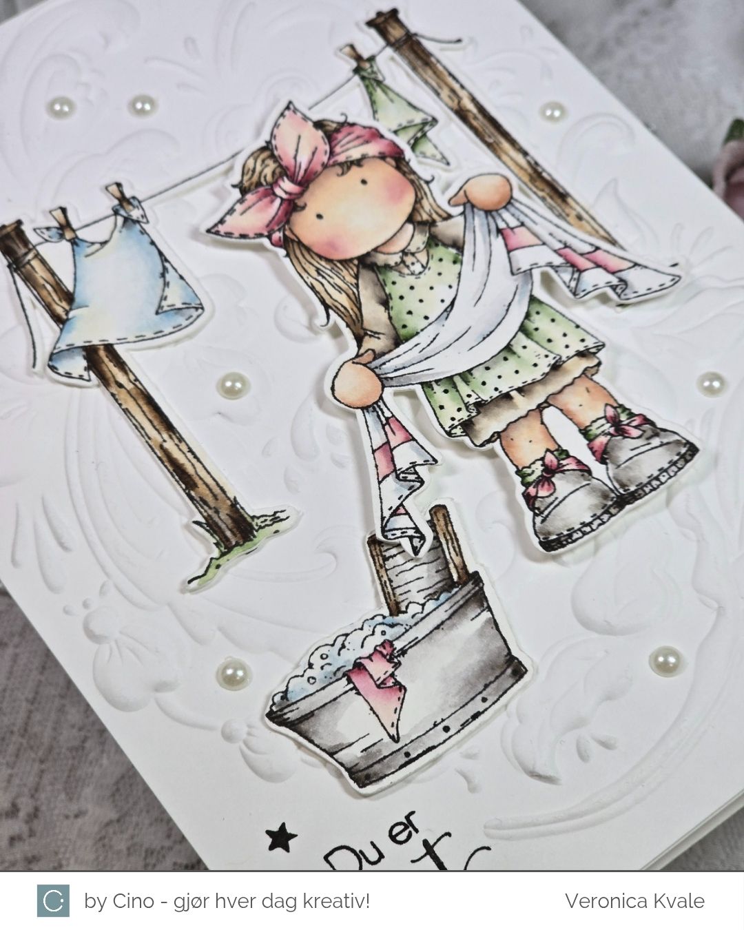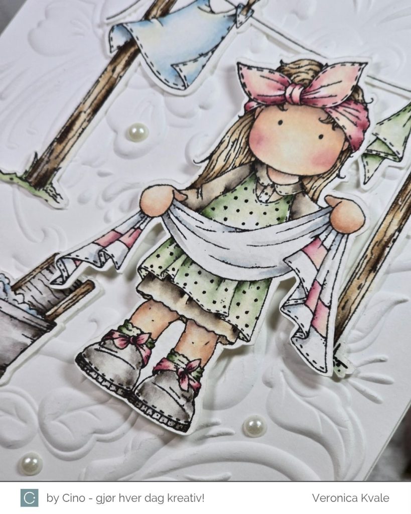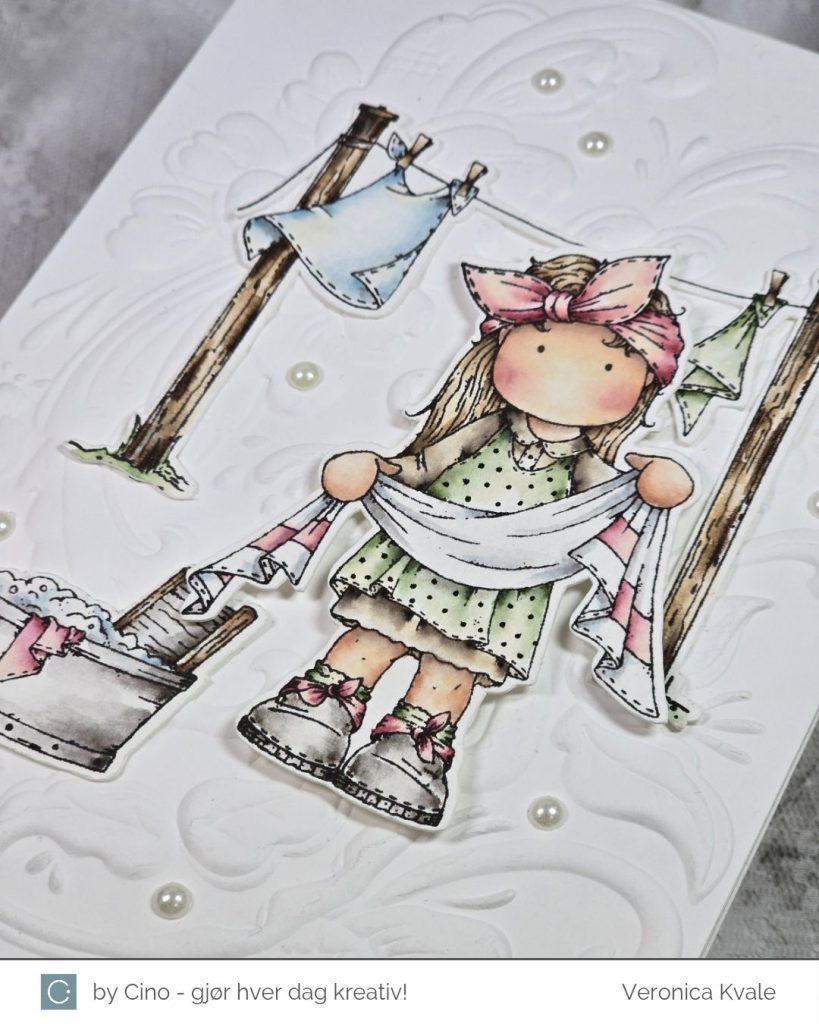 Dagens inspirasjonskort er en variant av kortet jeg viste i går, men her er motivet mer vårlig. I alle fall får jeg vårfornemmelse når klesvasken kan henges ute til tørk. Derfor har jeg også fargelagt dette motivet i friske vårfarger. Motivet heter TvättLina og kommer fra hÄnglar & Wings.