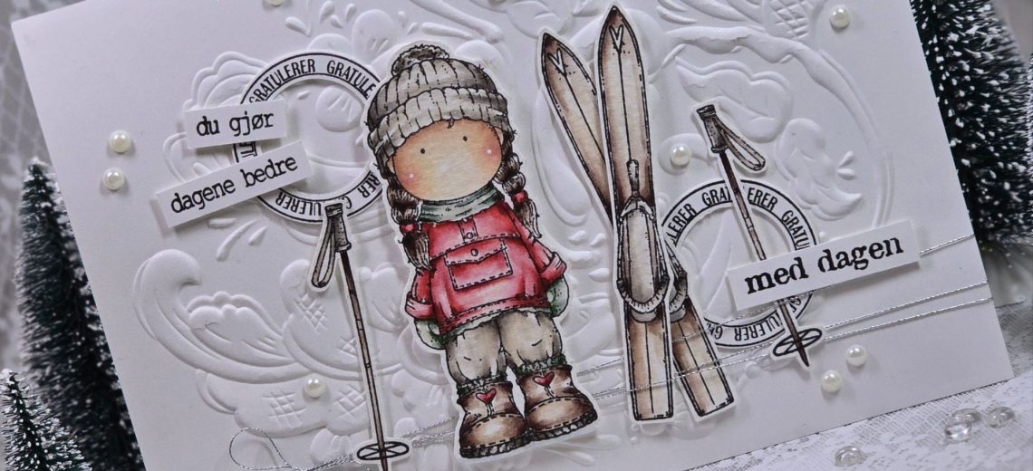 Jeg har laget noen kort med produktene fra årets julegave i nettbutikken, og først ute er dette kortet med motiv fra settet ‘Ut på tur’ fra hÄnglar & Wings. Settet var ikke en del av julegaven, og er fargelagt for lenge siden. Her har jeg kombinert det med produkter fra julegaven, samt et tidligere utgitt stempel med norske tekster.
