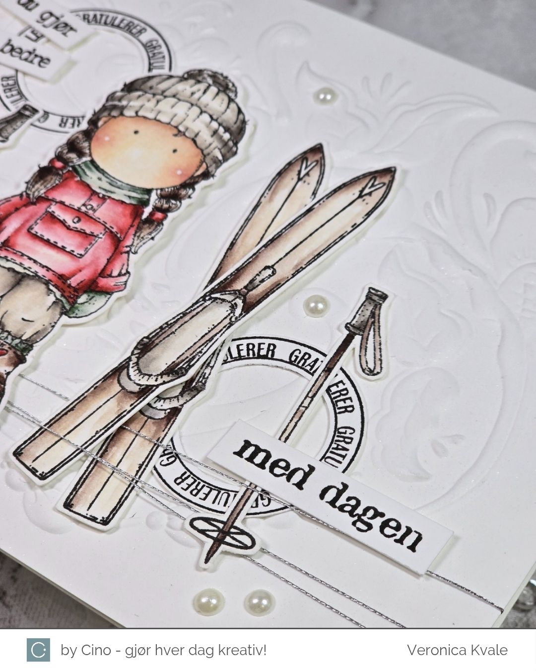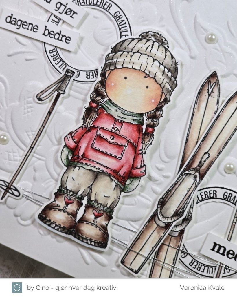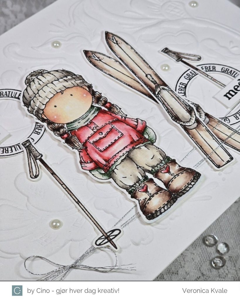 Jeg surret litt sølvtråd rundt bunn av bakgrunnen, og plasserte motivet, skiene og stavene utover kortet. Siden det ikke er så enkelt å stemple på en ujevn bakgrunn valgte jeg å bruke tekster som jeg kunne klippe eller stanse ut med en punch. Sirklene kommer fra settet ‘Bursdagsbillett’ som er gitt ut tidligere, i samarbeid med hÄnglar & Wings, og de andre tekstene kommer fra settet ‘Bursdagssirkel’, som var en del av årets julegave.