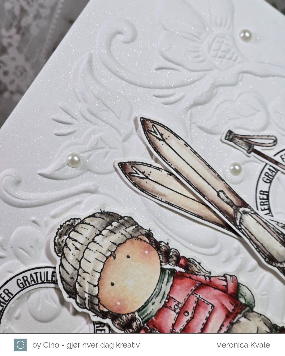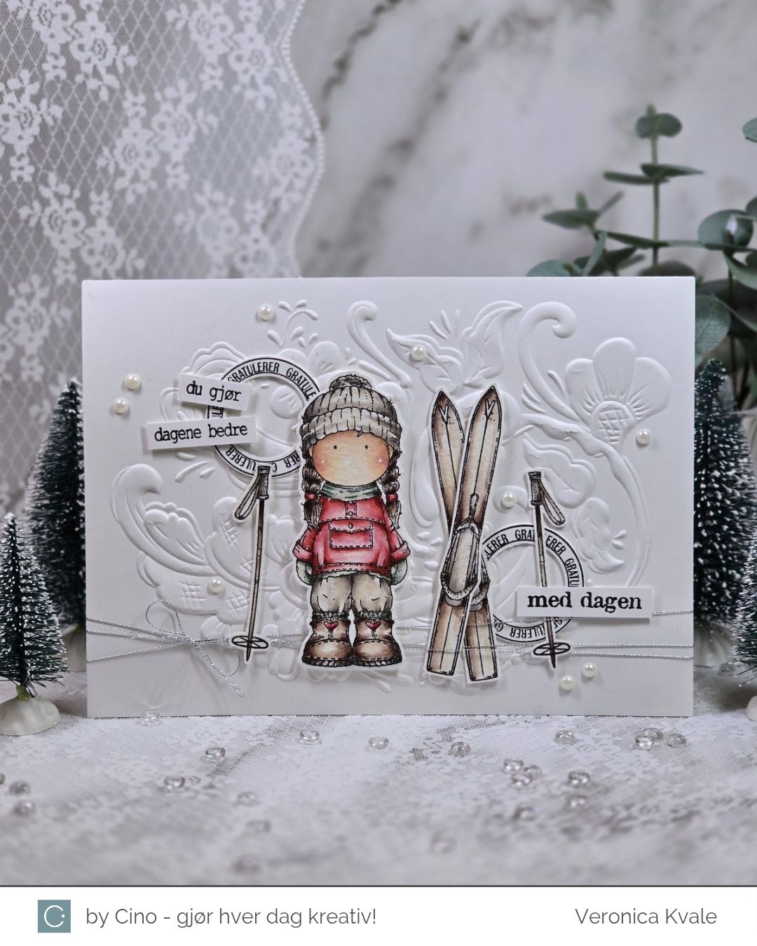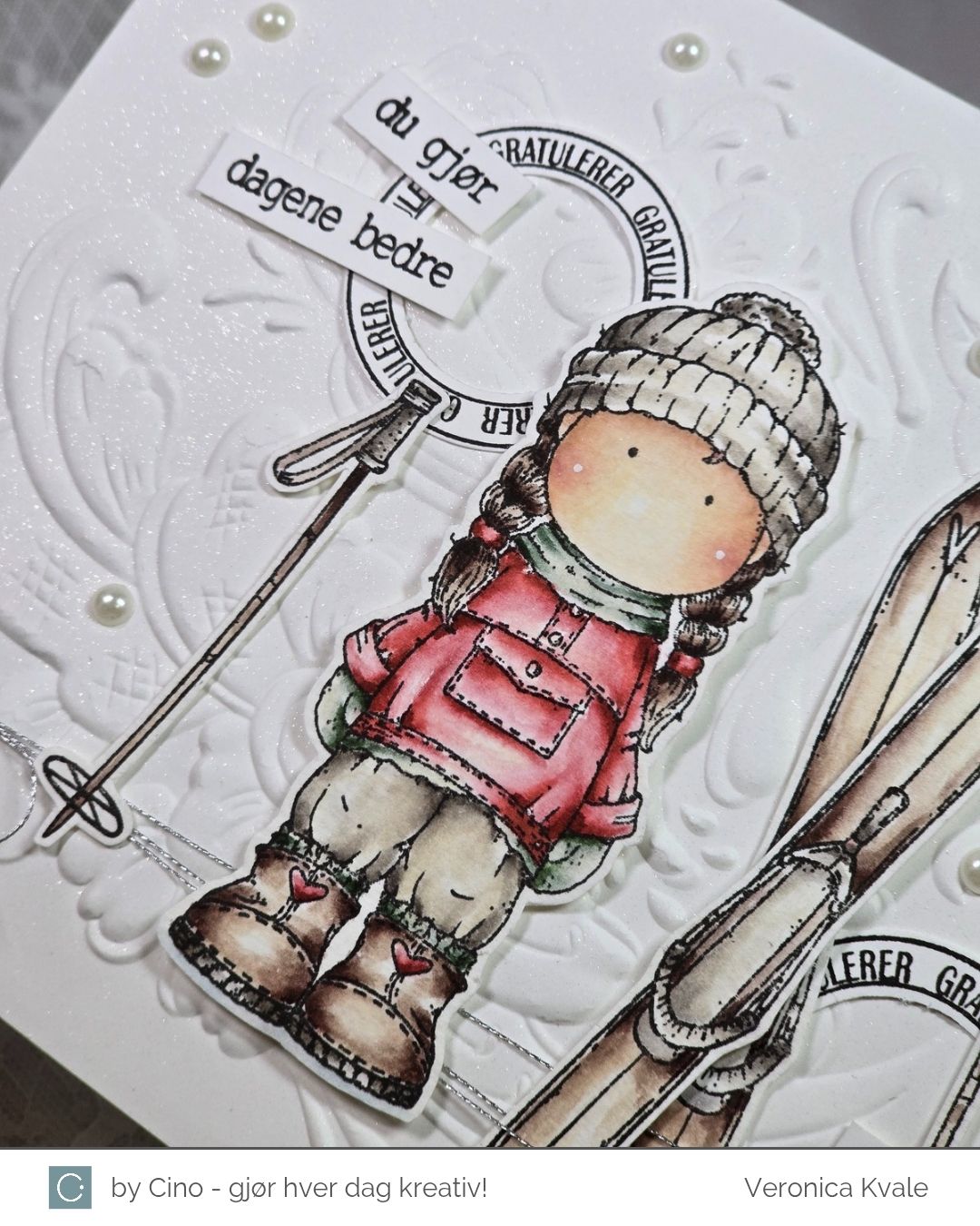 Jeg surret litt sølvtråd rundt bunn av bakgrunnen, og plasserte motivet, skiene og stavene utover kortet. Siden det ikke er så enkelt å stemple på en ujevn bakgrunn valgte jeg å bruke tekster som jeg kunne klippe eller stanse ut med en punch. Sirklene kommer fra settet ‘Bursdagsbillett’ som er gitt ut tidligere, i samarbeid med hÄnglar & Wings, og de andre tekstene kommer fra settet ‘Bursdagssirkel’, som var en del av årets julegave.