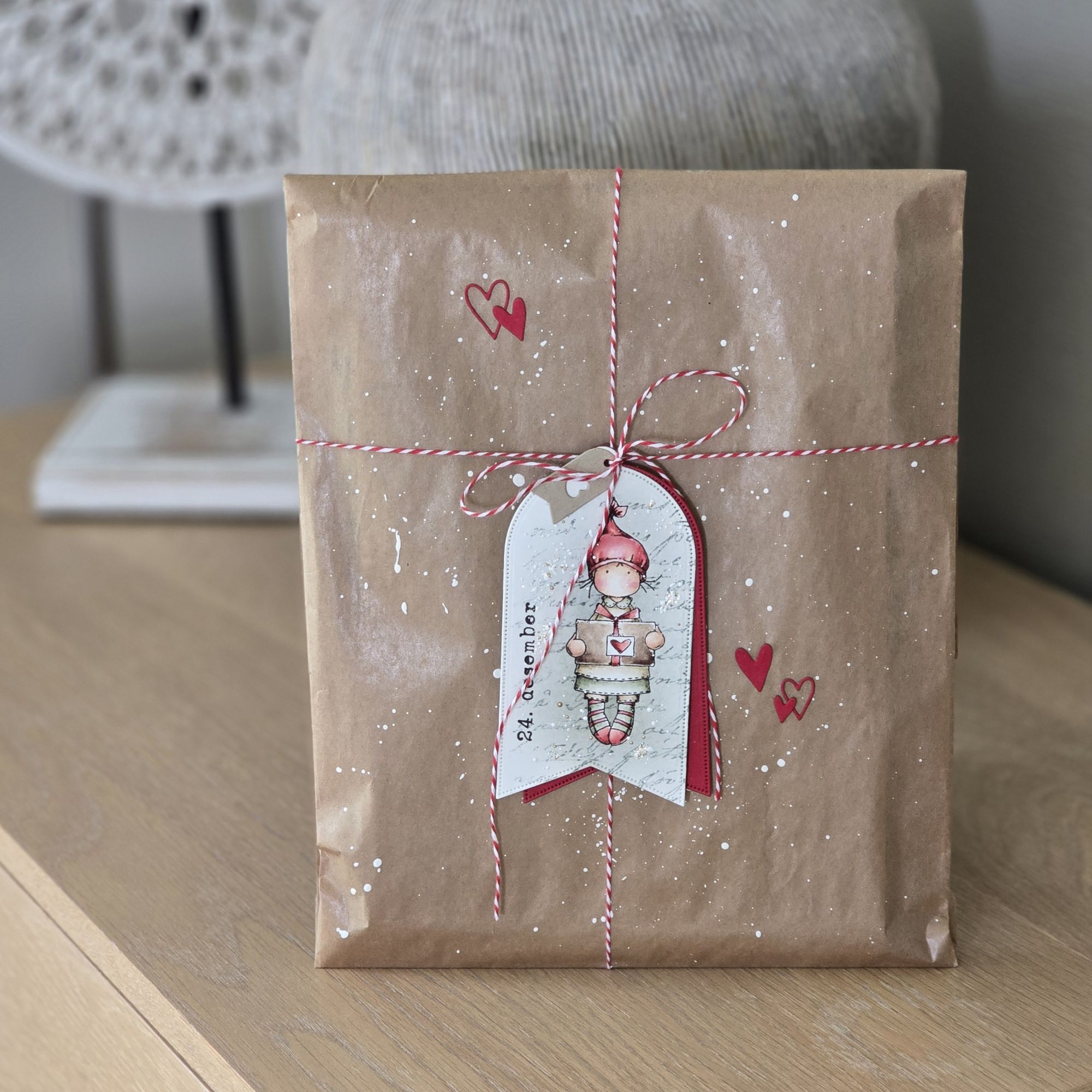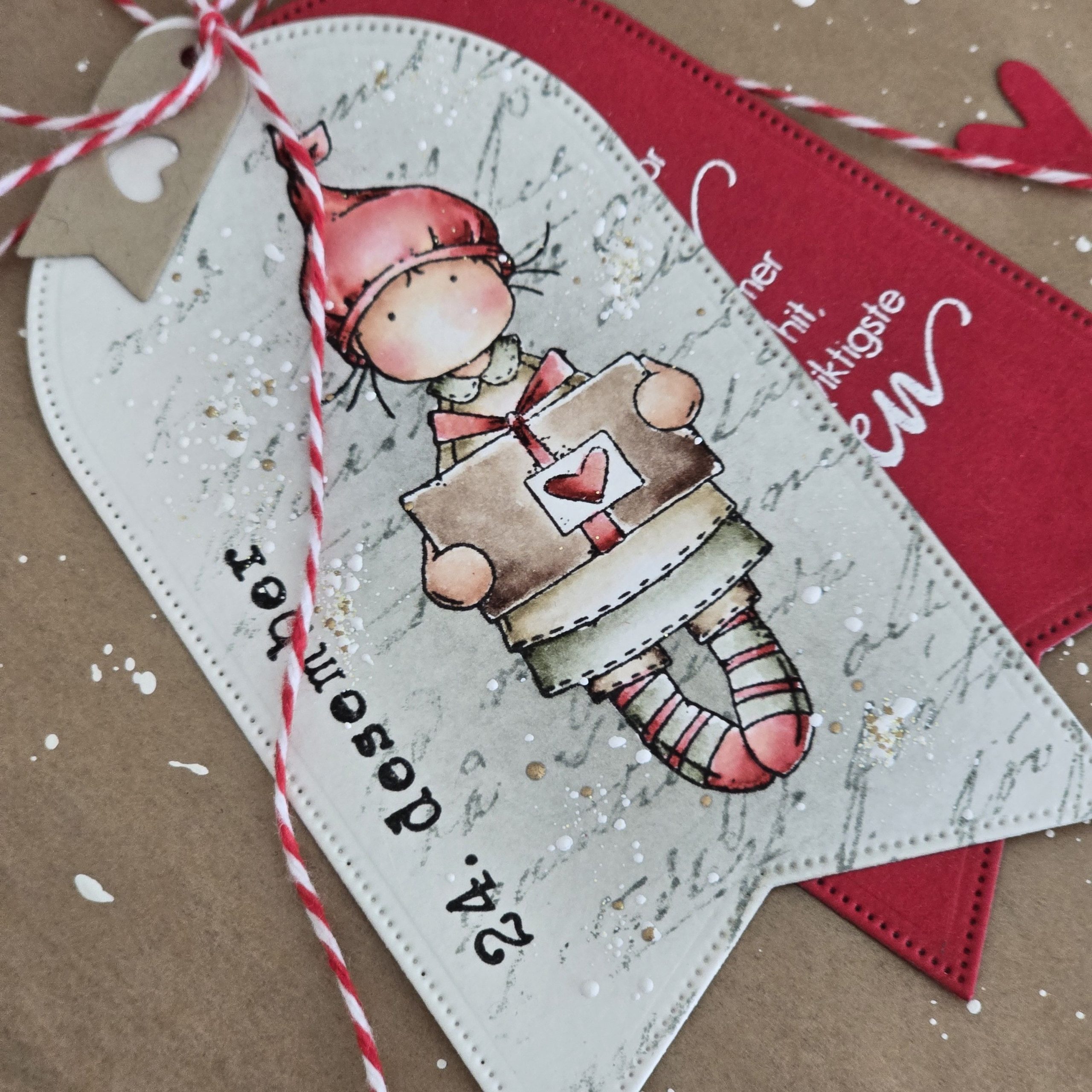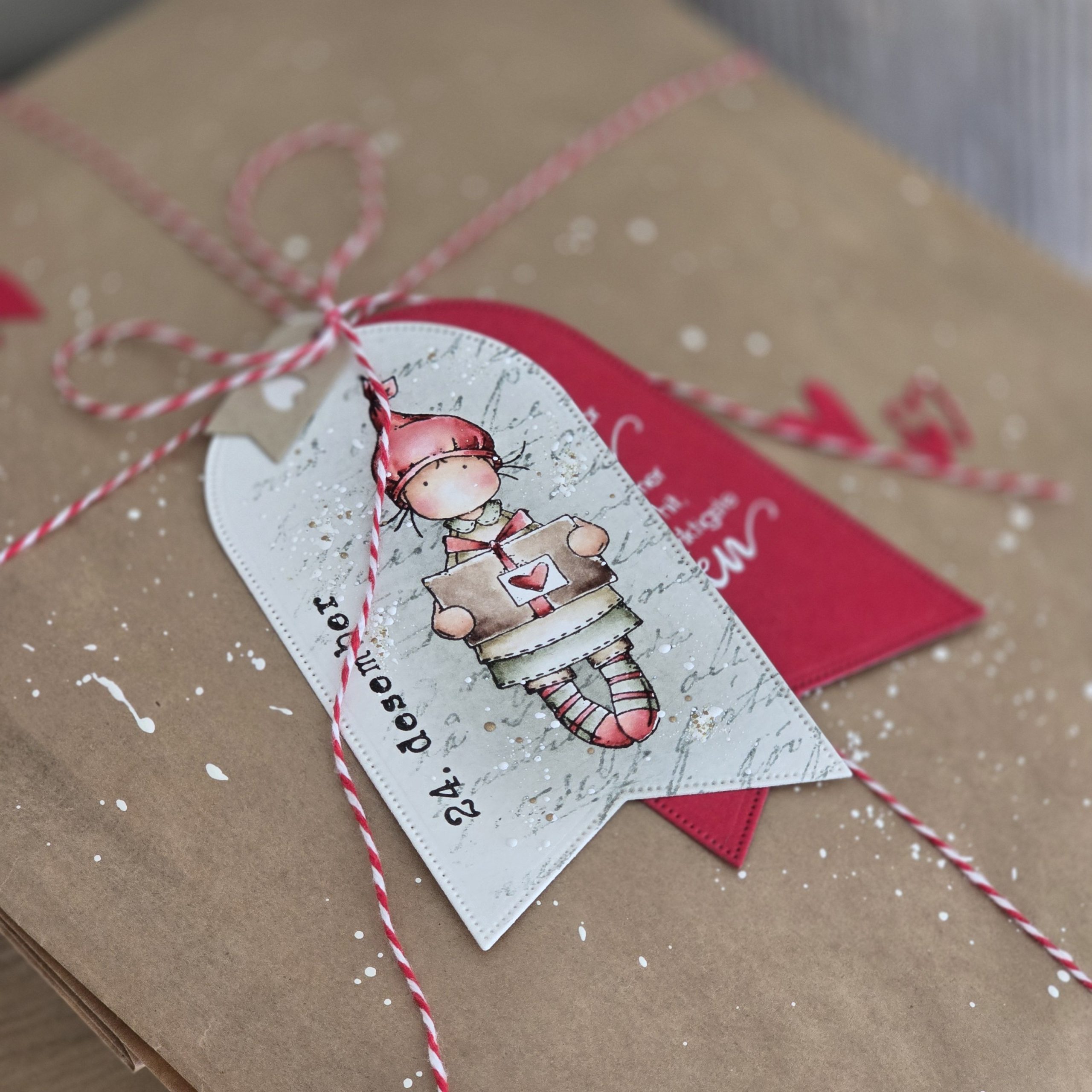 Bildene viser produkter brukt for å lage pakkelappen, IKKE innholdet i julegaven! Motivet er fargelagt med ZIG-tusjer.