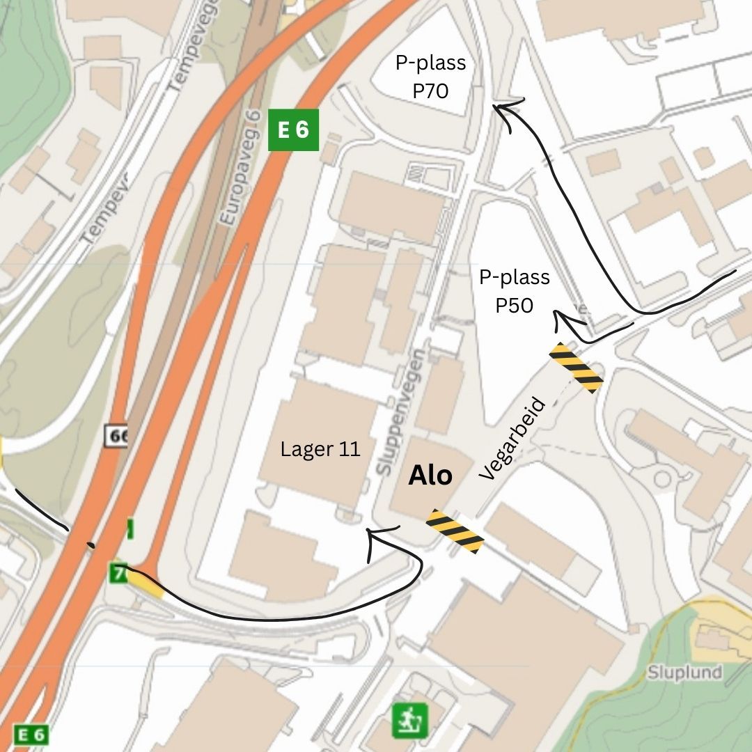 Se kart for adkomst til området med bil. Det er gratis parkering på p-plass P50 og P70 hele dagen. Det er også mulig å parkere mot avgift i området rett utenfor Alo og Lager 11. Vi møtes ved inngangen på Alo.
