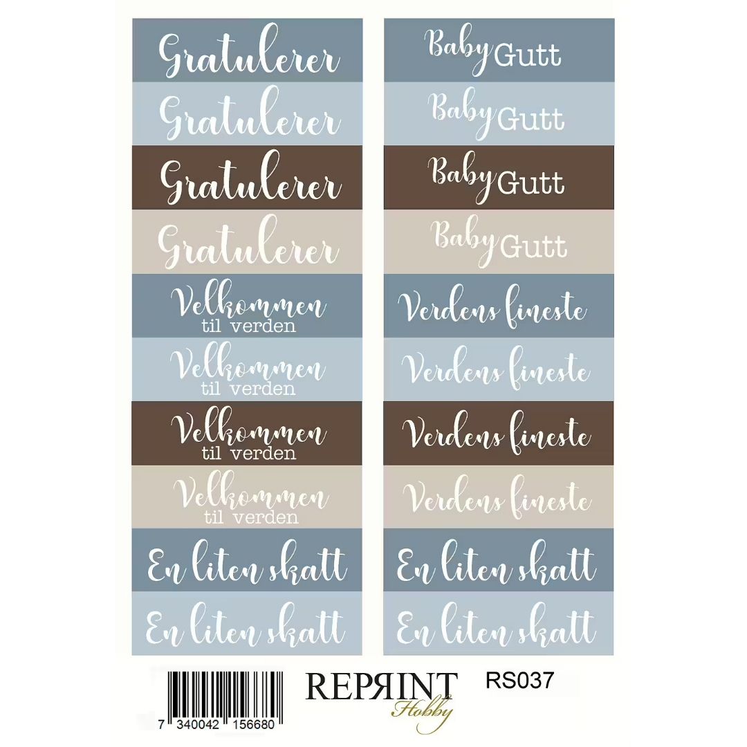 Klistremerkeark med norske tekster fra Reprint. Passer sammen med arkene i samme serie.