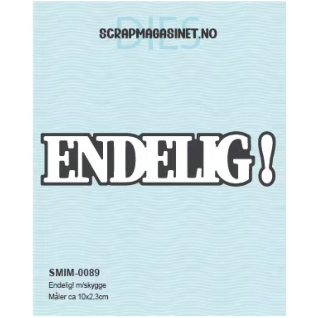 Inneholder 4 dies som stanser ut teksten ‘ENDELIG’ og et utropstegn, samt tilhørende skygger.